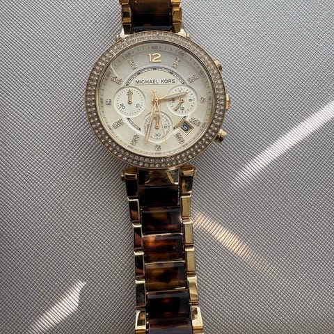 Michael Kors klocka i extremt bra skick. Klockan är väl omhändertagen och ser ut som ny! I färgen roséguld och puderrosa med fina stenar runt urtavlan. Är en av de mest exklusiva Michael kors klockan, den har används väldigt få gånger och bara till finare tillfällen. Ett batteribyte behövs då jag låtit den vara på samtidigt som jag inte använt den. Kvitto medföljer.
