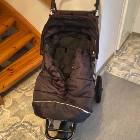BRIO sittvagn i röd och svart färg. Vagnen har fyra hjul och enkel sittdel med ryggstöd och fotstöd. Passar för vardagliga promenader och transport av barn som kan sitta upp själva. Under vagnen finns en enklare varukorg för förvaring av mindre saker.