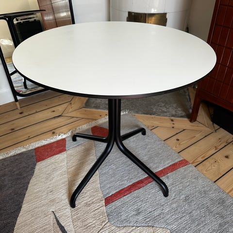 Bordsskivan: kommer från ett EM Table från Vitra, i ekfanér. Design Jean Prouvé - nypris 51 000kr