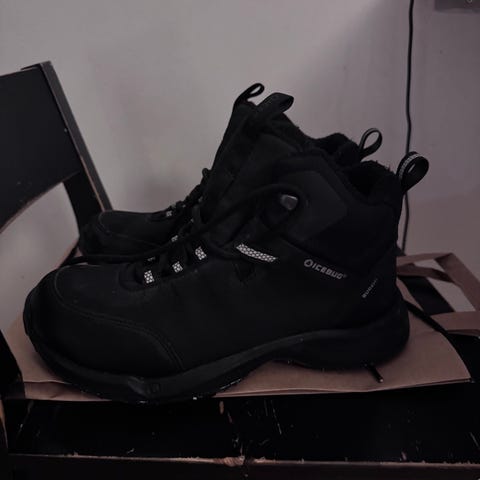 Icebug vinterskor i storlek 38. Stövelliknande modell i röd färg med svart sula och förstärkningar. Skorna har dragkedja framtill för enkel på- och avtagning. Grovmönstrad yttersula med dubbar för bättre grepp på is och snö. Invändigt foder för extra värme vid kallare väder. Passar för vinterbruk och promenader på hala underlag.
