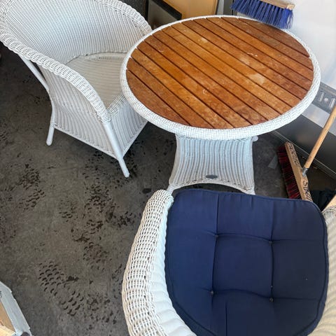 Matgrupp ute med glasbord och rottingstolar