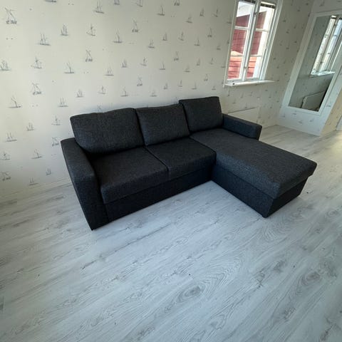 Här får du både en mysig hörnsoffa i svart skinn och skön dubbelsäng – och dessutom en schäslong med praktiskt förvaringsutrymme för till exempel sängkläder eller andra saker.
