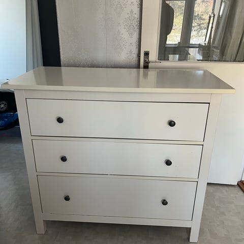 Mio byrå i vit färg med sex lådor, placerade i två kolumner om tre lådor vardera. Byrån står på ben och har runda knoppar i metall på varje låda. Passar som förvaringsmöbel i sovrum, vardagsrum eller hall för kläder, textilier eller andra mindre saker.