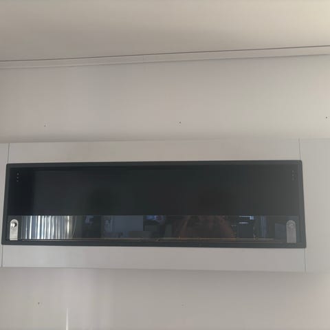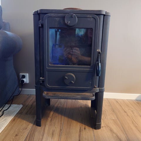 Ombyggd vedkamin med gallerhölje i metall. Effektiv med fläktar och elektrisk värmeväxlare i utsugsröret. Otroligt effektiv värmeutvinning.