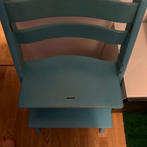 Stokke barnstol i trä. Klassisk modell med justerbar sittplatta och fotstöd som kan anpassas efter barnets längd. Stolen är utformad för att ge barnet en stabil och ergonomisk sittställning vid bordet. Passar för barn som kan sitta själva och uppåt, och kan användas både vid matbord och som sittplats i vardagen.