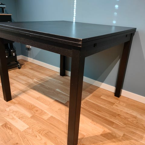 Bordet är väldigt praktiskt och är smart utdragbart. Själva ramen är fast och skivorna skjutbara så det är alltid stabilt, och lätt att ändra längd.