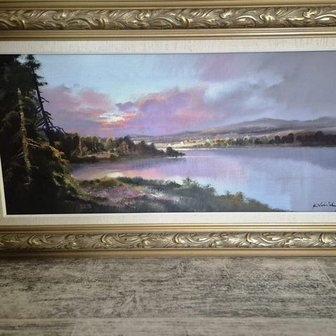 Konsttryck med havsmotiv och kustlandskap. Flera bilder föreställer havsvågor, klippor och strandmiljö med blommor, samt ett segelfartyg i svartvitt. Tavlan med ram 300:-