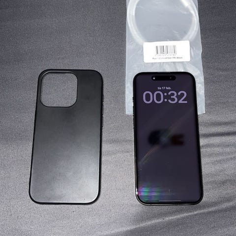 Apple iPhone 15 mobiltelefon med 128 GB lagringsutrymme. Batterihälsan ligger på 86% vilket klassas som normalt på apple. Fram skärmen har inga sprickor eller repor men baksidan har en lite spricka längst ner på en av kanterna, den syns i vissa ljus som visas på bilden. Jag skickar även med några skal som är oandvända