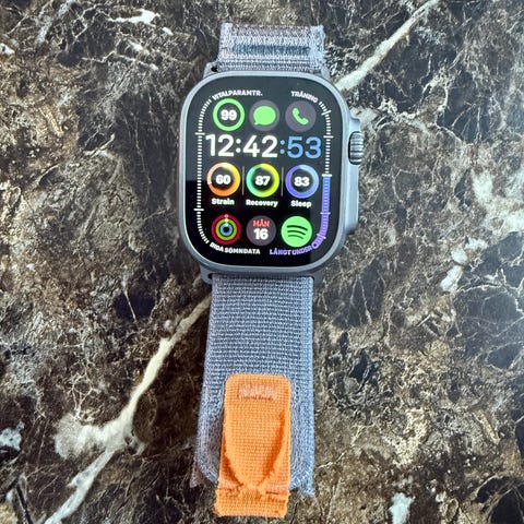 Armbandet är storlek M och batteriet har 100% batterihälsa.