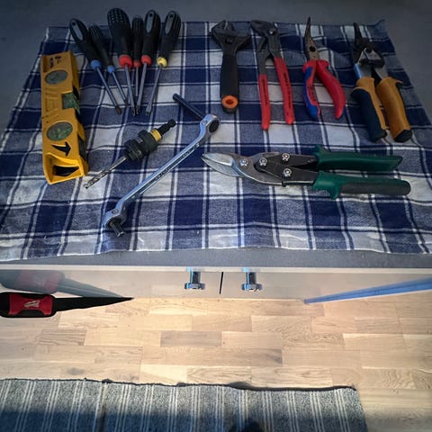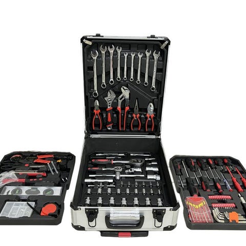 Verktygsväska av ABS-plast med förstärkt ram. Hjul och teleskophandtag. Välanvänd men håller länge till lås med nyckel. Div använda verktyg ingår, Benning spänningsprovare, Bacho och Whia Germany skruvmejslar 7,8,10,12,13mm, Bacho skiftnycklar och lednycklar 10-17mm, en Gedore Germany, Bacho polygrip och rörtång 1420, Knipex näbbtång, Bacho stor skiftnyckel 8074, Bodhus set med torx och insexnycklar tum och mm, skjutmått.