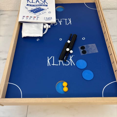 Klask bordsspel. Spelet består av en spelplan i trä med blå spelyta, magnetiska spelpjäser och tillbehör enligt bilderna. Regler och visuell guide till poängräkning medföljer. Avsett för två spelare och spelas på bord genom att styra pjäserna med magneter under spelplanen.