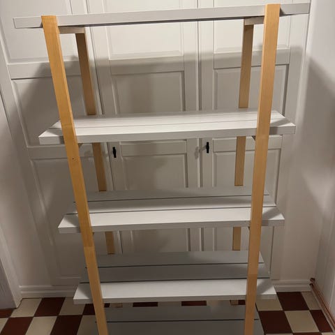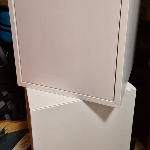 Vit vägghylla med många asymmetriska fack i olika storlekar som kan användas för förvaring av böcker, dekorationer och andra föremål. Passar att placera vertikalt och horisontellt på vägg eller som rumsavdelare