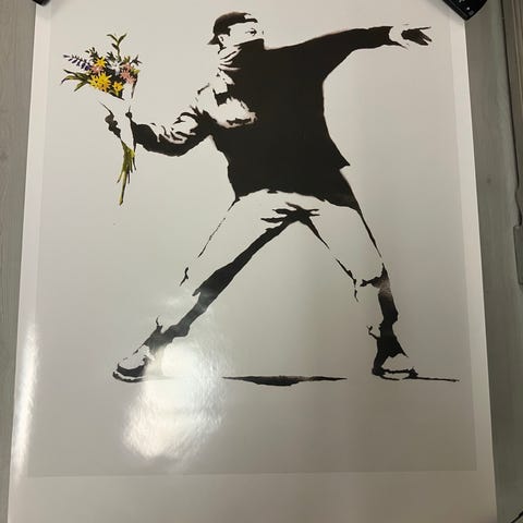 Silkscreen på papper ca 98 x 76 inkl ram, motiv av en apa som sitter på en låda och håller i en sprayburk, tillsammans med texten "The World Is Beautiful". Bilden är utförd i svartvita toner på ljust papper. Numrering 10/25 i nederkant, begränsad upplaga.