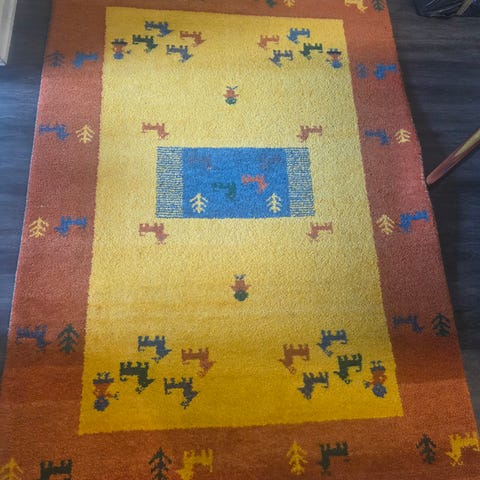 Klassisk handknuten matta i 100 % ull av hög kvalitet. Tidlös Gabbeh-design i gult och grönt med de karaktäristiska djurmotiven. Slitstark och i fint skick.