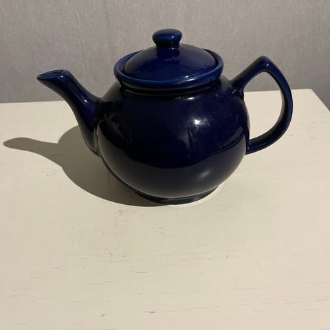 Rörstrand tekanna i blå glaserad keramik. Rund form med strukturerat mönster på utsidan, pip och handtag samt lock med knopp. Passar för servering av te eller andra varma drycker. Undersidan är stämplad med Rörstrand-stämpel. En liten skada på undersidan (se bild) som inte påverkar stabilitet eller syns när kannan står upprätt.
