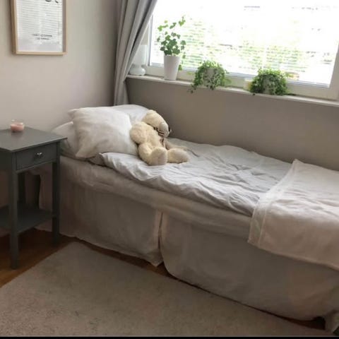 En 90cm säng med en extra tjock madrass ovanpå, samt en tunnare extramadrass under.