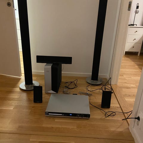 Denver hemmabiosystem högtalarpaket i silverfärg. Paketet består av flera golvhögtalare, en centerhögtalare och en aktiv subwoofer. Anslutningar för flera ljudkällor via RCA-ingångar på baksidan av subwoofern, samt separata högtalarutgångar för respektive kanal. Systemet är avsett för användning tillsammans med hemmabioanläggning eller stereoanläggning för flerkanalsljud i vardagsrum eller TV-rum.