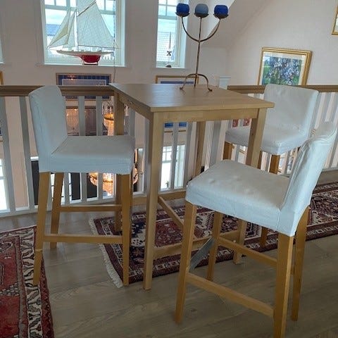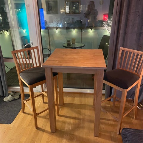 Säljer ett rejält barbord i ek tillsammans med tre barstolar, Henriksdal (ikea). Stolarna är omklädda med ett gråbeige tyg från Bemz. Bordet är köpt i annan möbelbutik ej ikea.