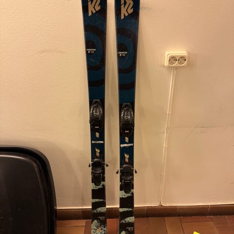K2 skidor med bindningar i blå och svart. Markerbindning, nyvallade