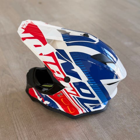 Raven crosshjälm i storlek L, 59–60 cm. Hjälmen är svart med skärm framtill och ventilationsöppningar. Märkt enligt ECE-R 22.05 med vikt cirka 1420 g ± 50 g. Utrustad med justerbart hakspänne och fäste för glasögon/rem runt hjälmen. Lämplig för motocross, enduro eller liknande motorcykelbruk där ECE-godkänd hjälm krävs.