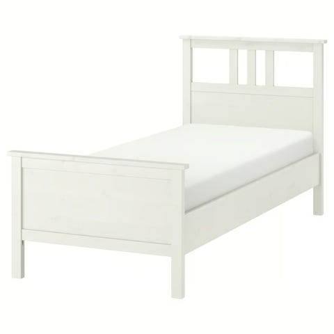 IKEA HEMNES sängram i vitt solitt trä med ribbotten. Följer med två skummadrasser MALFORS 12 cm tjocka, medelfasta. Sängen och madrasserna är i fint skick, men det finns något mindre färgskav på sängens huvudgavel och fotgavel. Madrasserna har skyddats med extra madrasskydd.