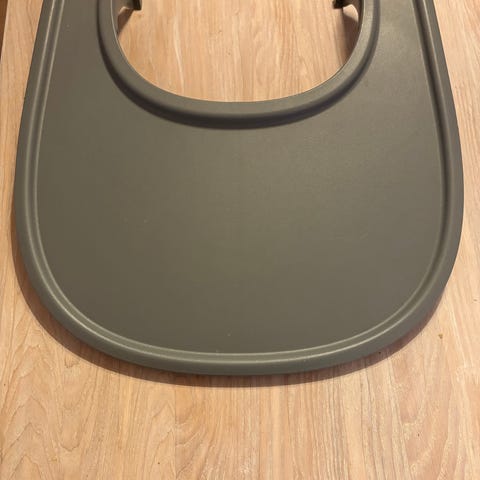 Stokke barnstol i grå plast med insats i mesh-tyg. Modellen är utformad för små barn och ger stöd för rygg och huvud. Stolen har en skålformad sittdel och kan placeras på golv eller annan plan yta. Passar för användning i hemmet, till exempel i badrum eller andra rum där barnet behöver en säker sitt- eller liggplats under uppsikt av vuxen.