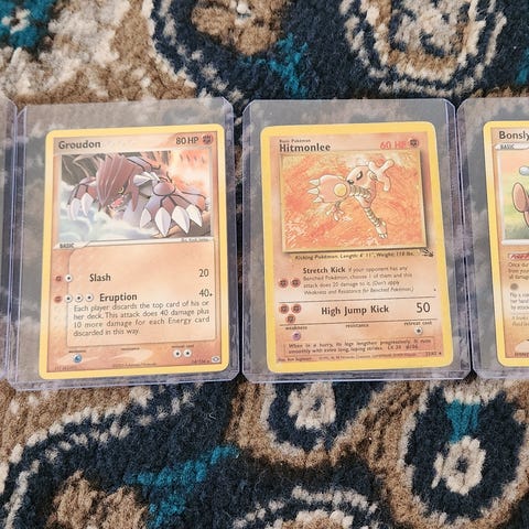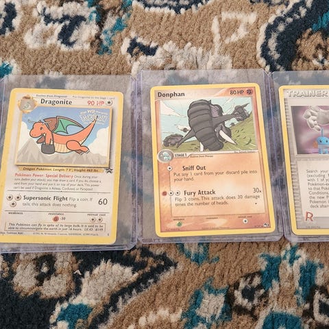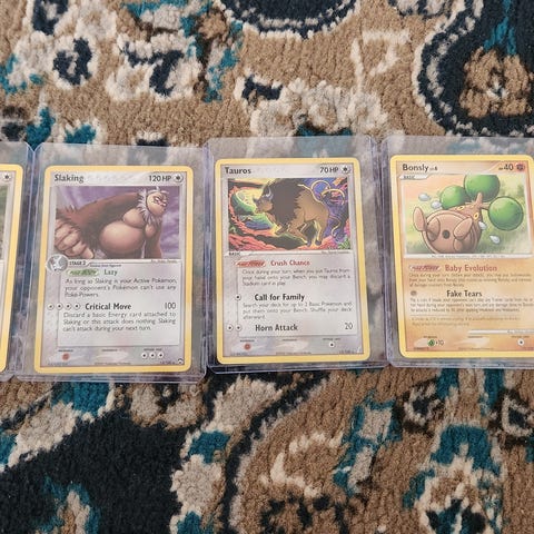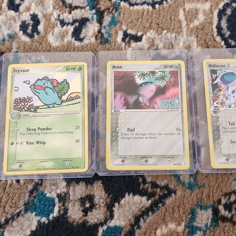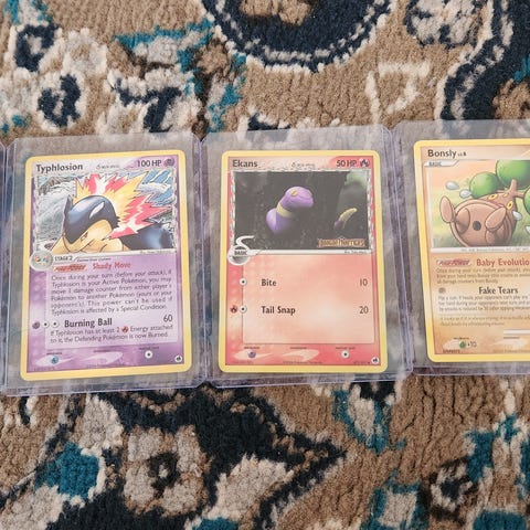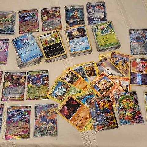 Pokémon samlarkort med blandade motiv. Kort visas i plastfickor på bilderna. Framsidor och baksidor framgår av fotona, där olika Pokémon och korttyper kan ses. Lämpliga för samling eller byte av Pokémonkort. Eventuella specifika upplagor, språk och årtal framgår bäst vid närmare granskning av korten på plats eller via extra bilder.