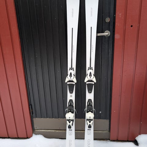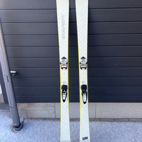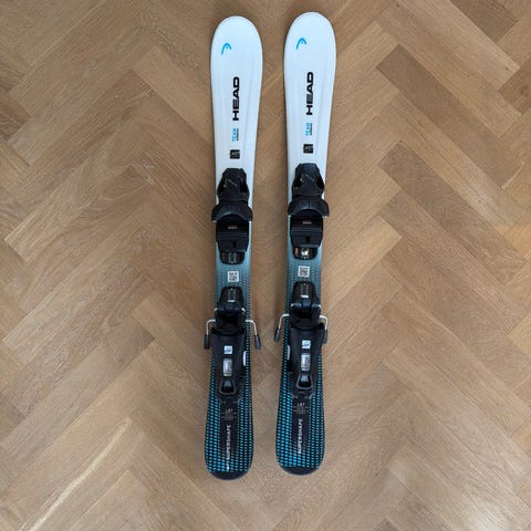 vit färg med Joy 9 bindningar. Skidorna är utrustade med integrerade bindningar som kan justeras efter pjäxstorlek.