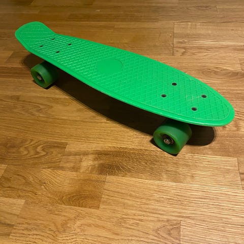 Skateboard med orange undersida och svart griptape på ovansidan. Komplett med truckar och hjul.