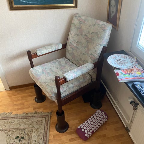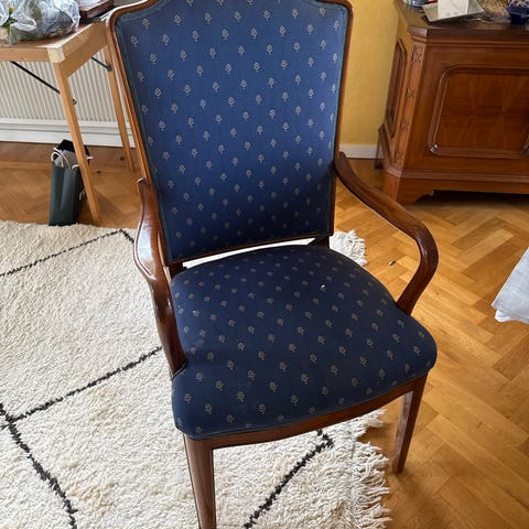 Ommålad och omklädd gammal karmstol. Lite nersutten. 499kr eller bud.