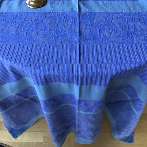Stor bomullsduk ( 100%) från Åhléns. Halvblank. Mått 280x132 cm. Vårt bord, som duken ligger på, är 240x120 cm. Duken är i fint skick. Pris 120kr.