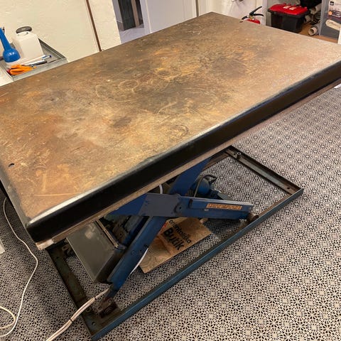 Bordsskiva och hjulen är egen monterade och hemma byggt. Bordsskivan sprayad i silver/grå färg.
