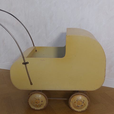 Stabil och välgjord – betydligt kraftigare än moderna dockvagnar. Perfekt till lek, samling eller som dekorativ inredningsdetalj i barnrum.