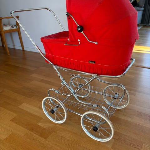 Mycket charmig dockvagn i klassisk 70-talsstil, tillverkad ca 1970–1975. Naturtrogen modell av dåtidens barnvagnar med kromat metallchassi, fyra hjul, varukorg undertill och röd sufflett i tidstypiskt material.