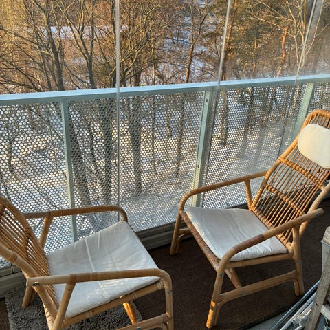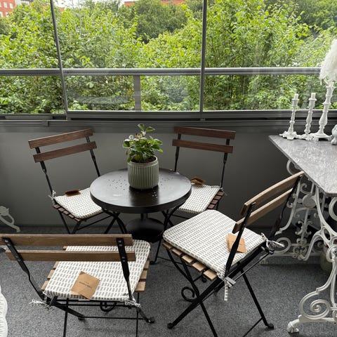 Balkongmöbler i form av ett caféset med bord, två stolar och en liten soffa med plats för två ifrån ikea.