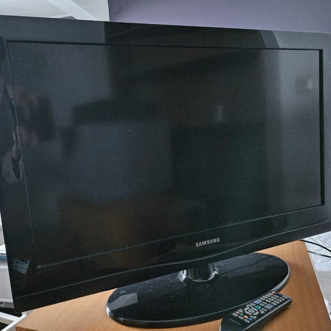 Samsung tv i svart färg. Platt skärm med bordsstativ och medföljande fjärrkontroll saknas. Passar för användning i vardagsrum, sovrum eller som extra tv. Exakta mått, tumstorlek och modellbeteckning vet jag inte.