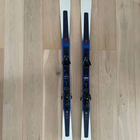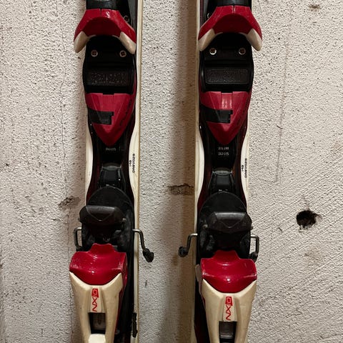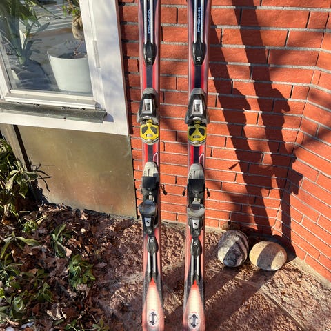 Alpina skidor med bindningar. Skidorna har rödsvart ovansida och svart belag. Passar för utförsåkning i pist. Bindningarna är monterade på skidorna och kan justeras efter pjäxstorlek inom visst spann beroende på modell.