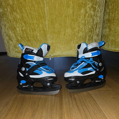 Ställbara skridskor för barn i storlek 33-36. Modellen har hårt yttre skal med justerbara spännen över fot och vrist för stabil passform.