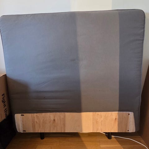 Ikea BORÖY sänggavel i grått tyg. För en 120cm säng. Sänggaveln har en slät, vadderad framsida och är avsedd att placeras bakom en säng mot väggen. Passar som ryggstöd vid läsning eller sittande i sängen och ger ett neutralt uttryck i sovrummet.