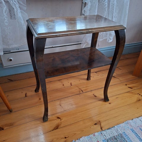 Bordet har rektangulär skiva med intarsialiknande dekoration på ovansidan.