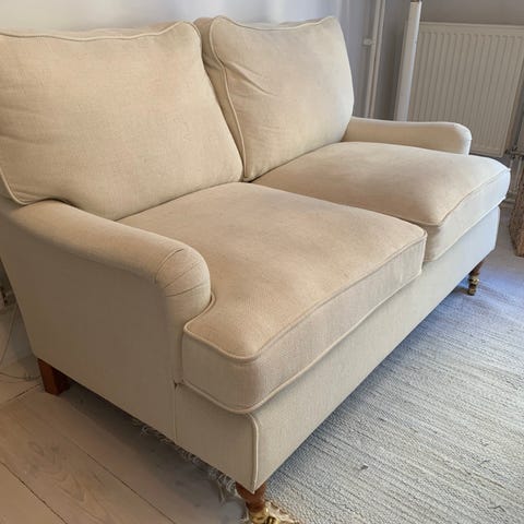 Fin 2-sits soffa i vit tygklädsel.