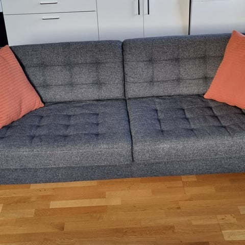 Beige färg i boucletyg. Lätt att torka av vid behov.