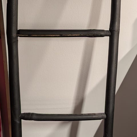 Svart trä stege för dekoration eller hänga textilier på. 190x55 cm. 200 kr.