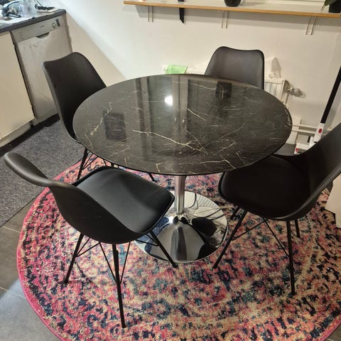 Vit runt bord och fyra stycken stolar