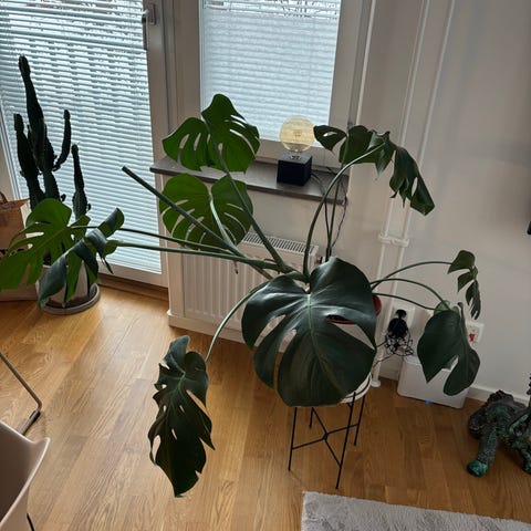 Monstera krukväxt i plastkruka. Växten har gröna, hjärtformade blad och långa rankor som kan klättra eller hänga fritt. Passar som inomhusväxt i ljusa rum utan direkt stark sol. Levereras i befintlig kruka med fat.