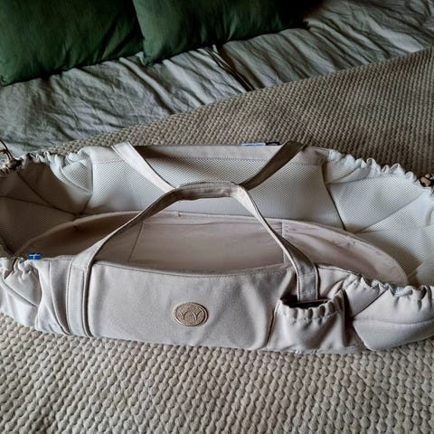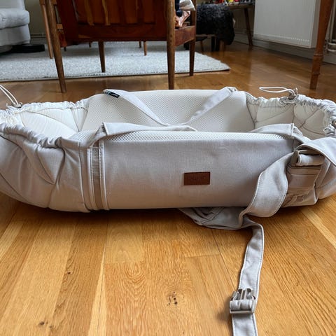 Najell SleepCarrier babynest i grått tyg med vit insida. Babynestet har bärhandtag och justerbara remmar så att det kan användas både som bärnest och som trygg sovplats för spädbarn. Mjukt vadderade kanter och botten ger stöd och avgränsning runt barnet. Passar exempelvis i barnvagn, på soffan eller i sängen enligt tillverkarens anvisningar. Material enligt märkning från Najell.