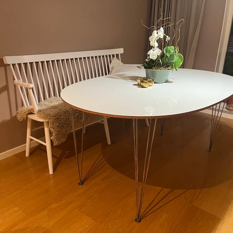 Begagnat skick. Repor och märken förekommer i bordsskivan, bordet är dock fullt funktionellt och stabilt.