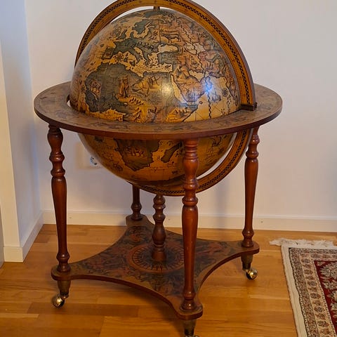 Royal Louis 1779 modellfartyg i trä i brun ton. Detaljerad modell av ett historiskt segelfartyg med flera master, rigg och segel. Fartyget står monterat på en träbas med metallskylt märkt "Royal Louis 1779". Passar som dekorativt samlarobjekt eller inredningsdetalj i hem eller kontor.