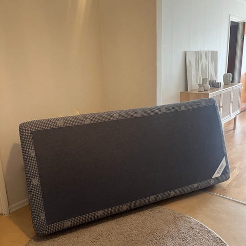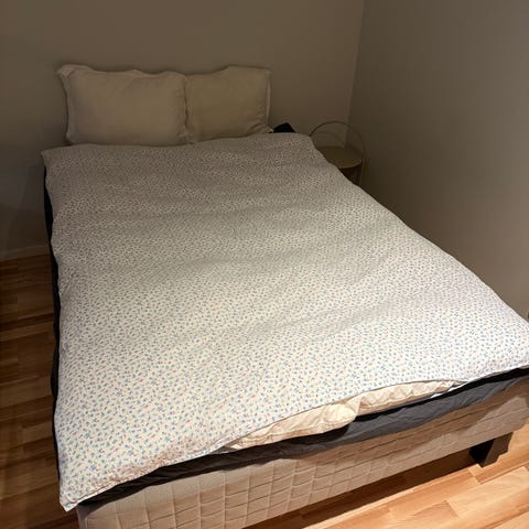 säng med madrass bäddmadrass. Passar som enkel- eller mindre dubbelsäng beroende på mått. Lämplig för sovrum eller gästrum.