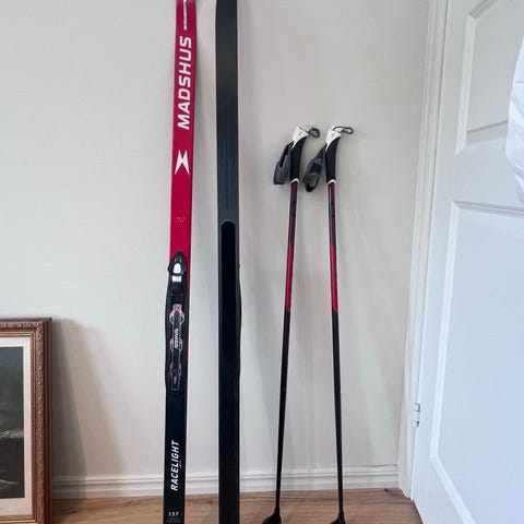 Vallningsfria längdskidor 100 cm Madshus Racelight MG med Rottefella bindning, stavar 90 cm - 300 kr
